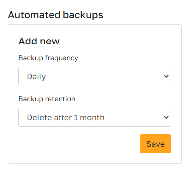 You can set a backup frequency of hourly, daily, weekly or monthly and can optionally set a retention (how long a backup is kept) of 1 day up to 1 year.