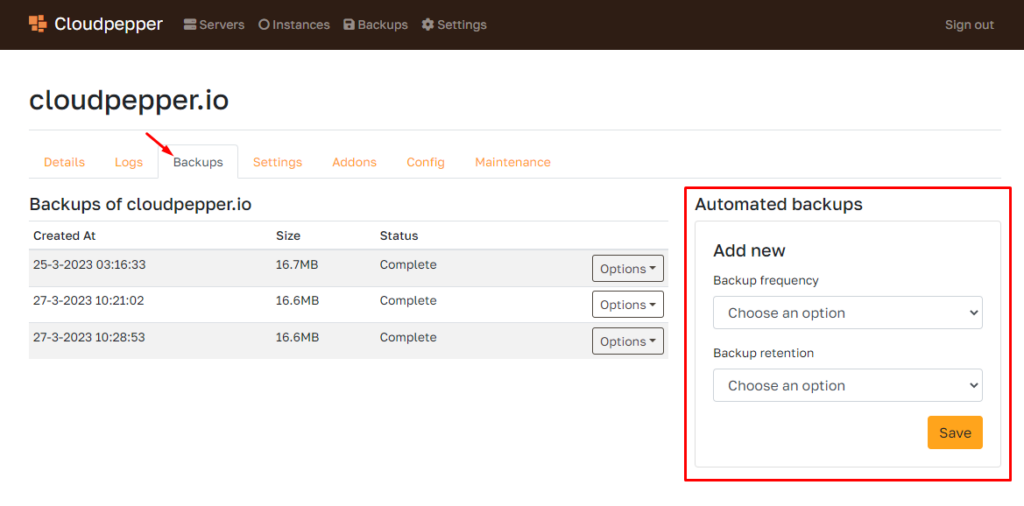 Under Backups you will find an overview of your backups and the option for Automated Backups.