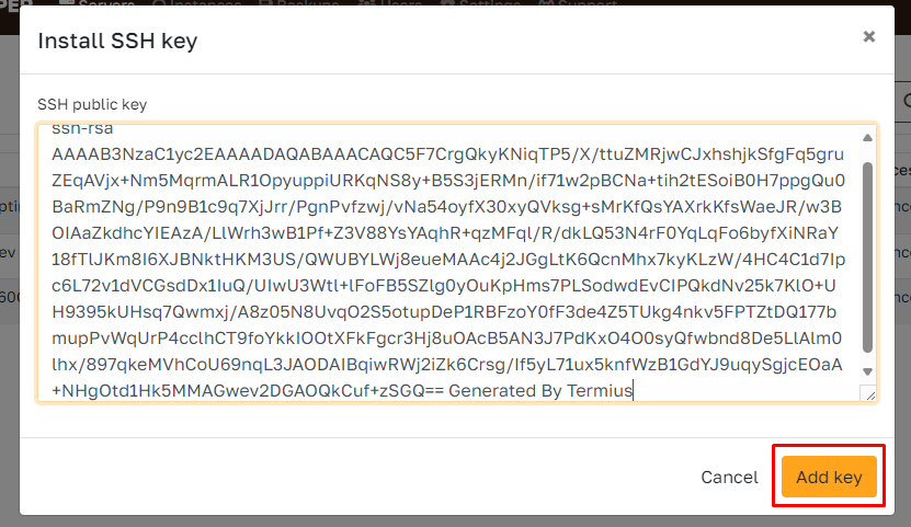 Paste the public key generated by Termius and click Add key.